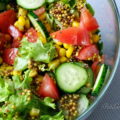 Warzywa dokładnie myjemy. Sałatę rwiemy na małe kawałki i wrzucamy do miski. Ogórka kroimy na ćwiartki, a następnie na plasterki, rzodkiewki kroimy w plasterki, a paprykę w kostkę. Wszystko dorzucamy do sałaty.