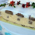 Toffinek od samego początku wzbudził moje zainteresowanie. Znalazłam go w gazetce z przepisami i czytając składniki stwierdziłam, że musi być pyszny. Po kilku drobnych przeróbkach tak właśnie jest 😉 Pomimo, że zawiera dużo masy nie jest ciężki. Jego głównym składnikiem jest śmietana kremówka połączona z kajmakiem i zatopionymi biszkopcikami. Smak jest doskonale zrównoważony dzięki czekoladowemu biszkoptowi i bitej śmietanie z adwokatem.