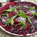 Buraki myjemy, nacieramy oliwą z oliwek, pieprzem i solą. Każdego buraka owijamy w osobną folię aluminiową i wkładamy je do piekarnika nagrzanego do 200°. Ciężko określić czas pieczenia, ponieważ zależy on od wielkości naszych buraków. Pieczemy je do momentu kiedy będą miękkie (jeśli bez problemu wbijemy w nie wykałaczkę). Upieczone buraki obieramy ze skórki (najlepiej jak są jeszcze ciepłe) i kiedy ostygną tniemy je na bardzo cienkie plasterki. Ja używam do tego mandoliny.